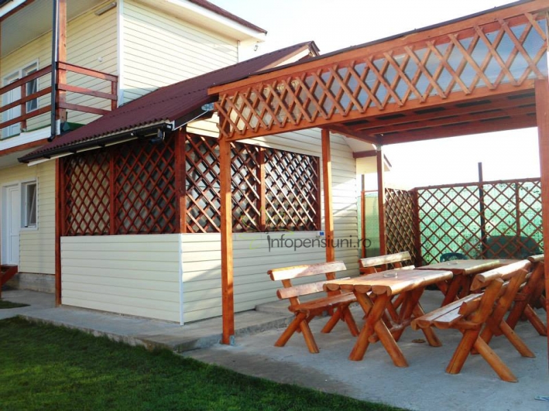 Linistea oferita de spatiul verde din jurul vilei invinge agitatia din centrul statiunii. Puteti sa va relaxati sub o umbreluta intr-un hamac sau un sezlong citind o carte sau o revista, savurand o bautura rece. . . . Etc. Terasa cu flori, mese si scaune va invita la relaxare dupa o zi torida.
